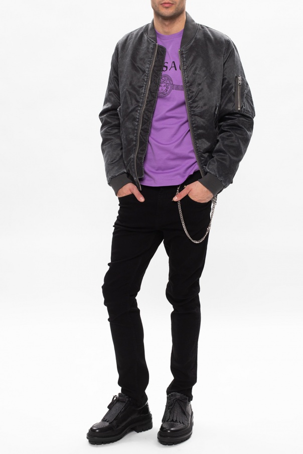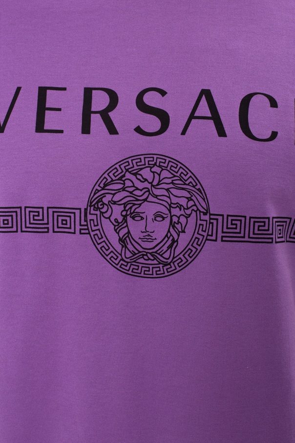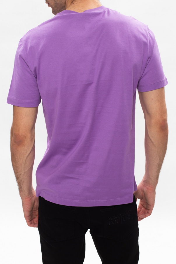 Purple crewneck T-shirt from Versace. Cut from cotton, this style features an elasticated collar and black logo print for the brand recognition.