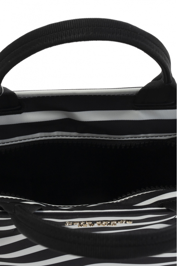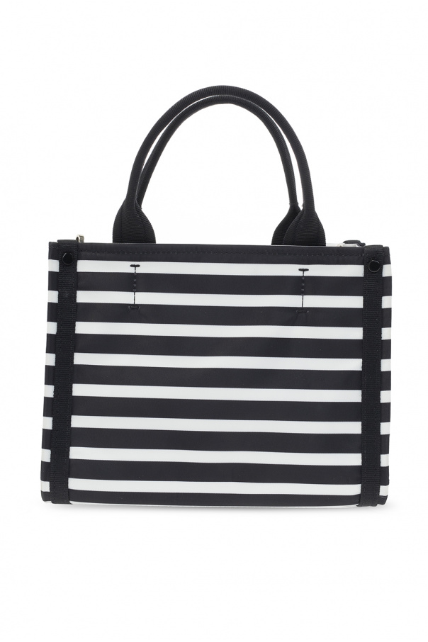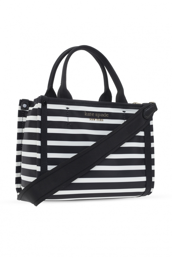 Black and white ‘Sam’ shoulder bag from Kate Spade. Fastened with a zip, this design is decorated with a stripe pattern and a logo appliqué. It is complete with two half-round handles, adjustable shoulder strap, silver-tone metal hardware and one internal compartments with one slip pocket and one zip pocket.