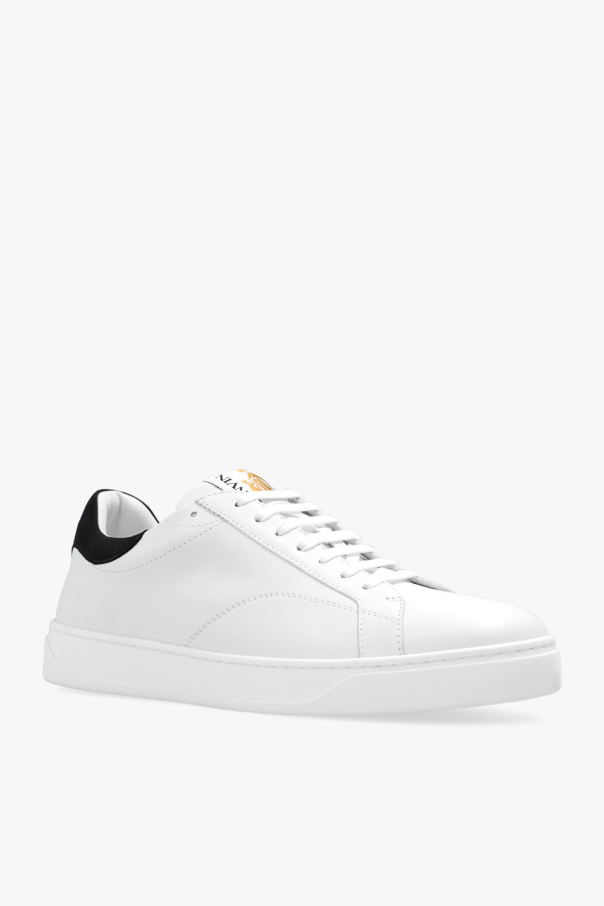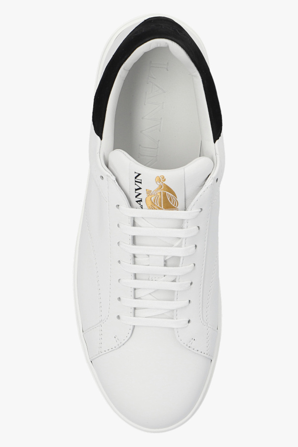 White \'DDB0\' sneakers from Lanvin. Crafted from calf leather, this lace-up model sits on a white rubber sole and features a gold-tone logo patch and a black heel counter with an embroidered logo.