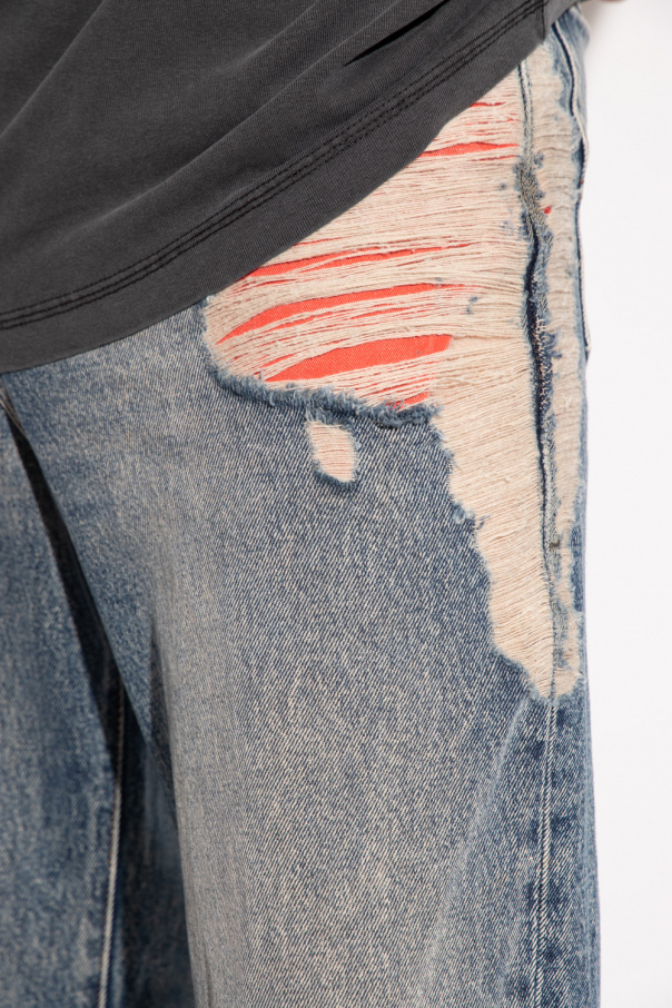 Blue and beige ‘1955’ distressed jeans from Diesel. Fastened with buttons, this tapered leg pair is made from cotton and enriched by a worn effect and logo patch in beige, blue and red.