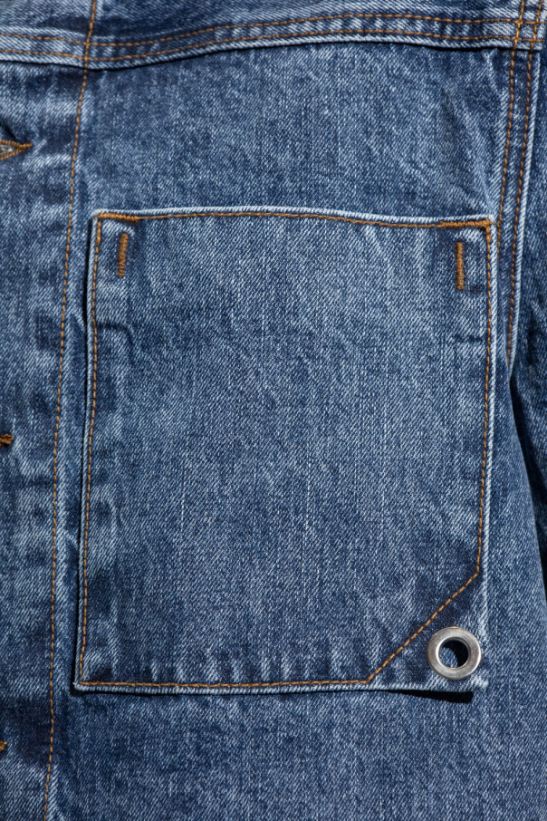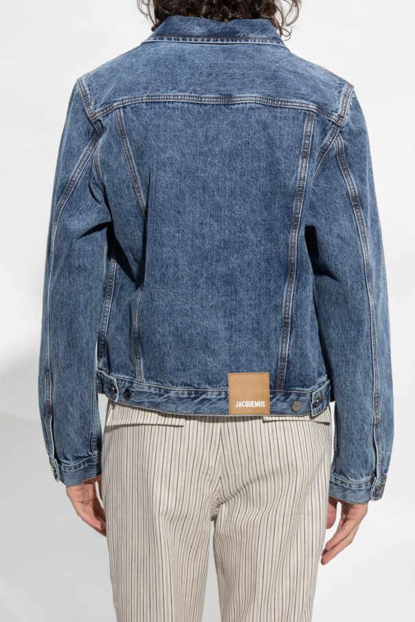 Dark blue ‘Jao’ denim jacket from Jacquemus. Fastened with buttons, this style features a collared neckline, one slip pocket on the front, a brown logo patch at the back and long sleeves with button cuffs.