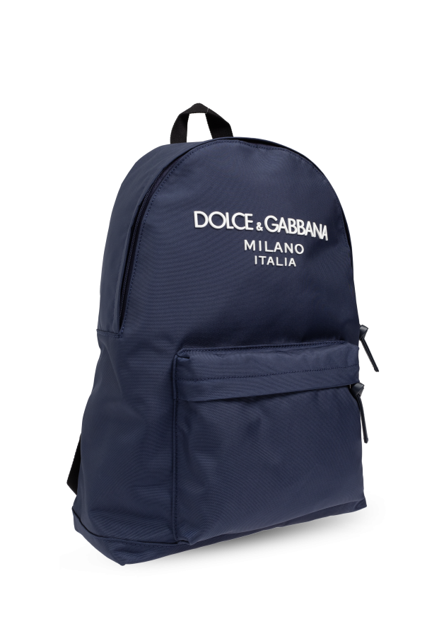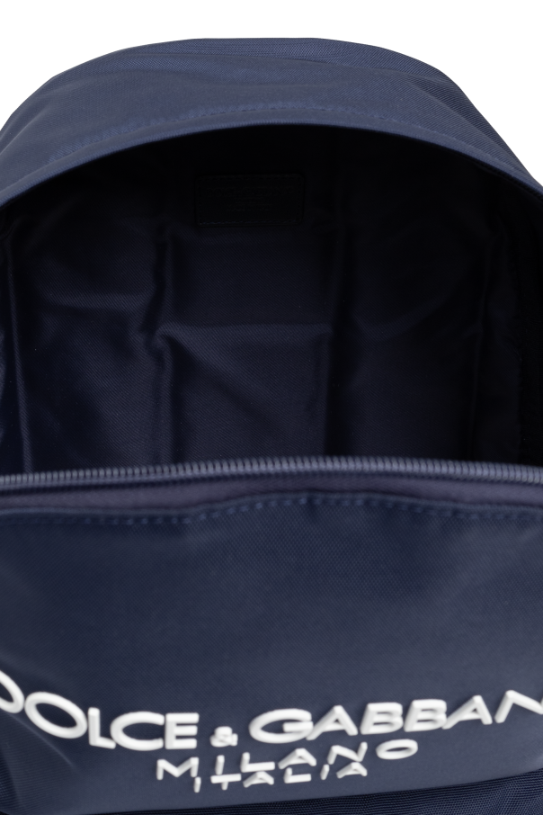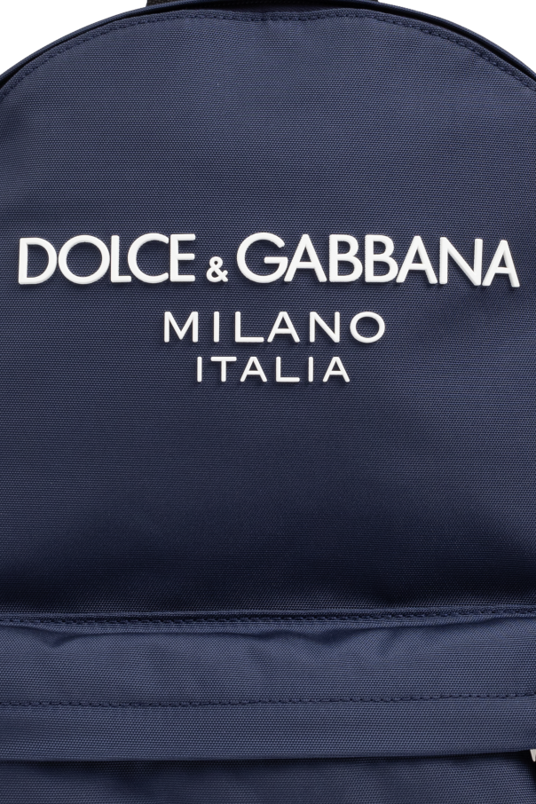 Introducing the Dolce & Gabbana Kids Backpack – a paragon of elegance and practicality from the illustrious fashion house. Crafted from resilient navy material, this backpack boasts a classic silhouette with gracefully rounded top edges. The front is adorned with a prominent, zippered pocket and emblazoned with the iconic DOLCE & GABBANA logo alongside \"MILANO ITALIA\" in sophisticated white lettering. Black zippers with sturdy pulls ensure both functionality and style. The interior, spacious and lined with the same durable fabric, offers ample room for essentials. Adjustable, padded shoulder straps and a convenient top handle provide comfortable carrying options. Why Choose This Product? Exquisite Design: A blend of timeless elegance and modern practicality. Durable Material: Crafted to withstand daily wear and tear. Comfort: Padded straps ensure ease of use. Exclusive Branding: Features the distinguished Dolce & Gabbana logo. Versatile Use: Ideal for kids, perfect for school or casual outings.
