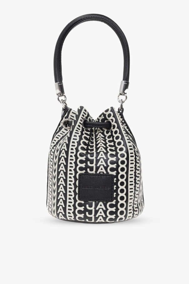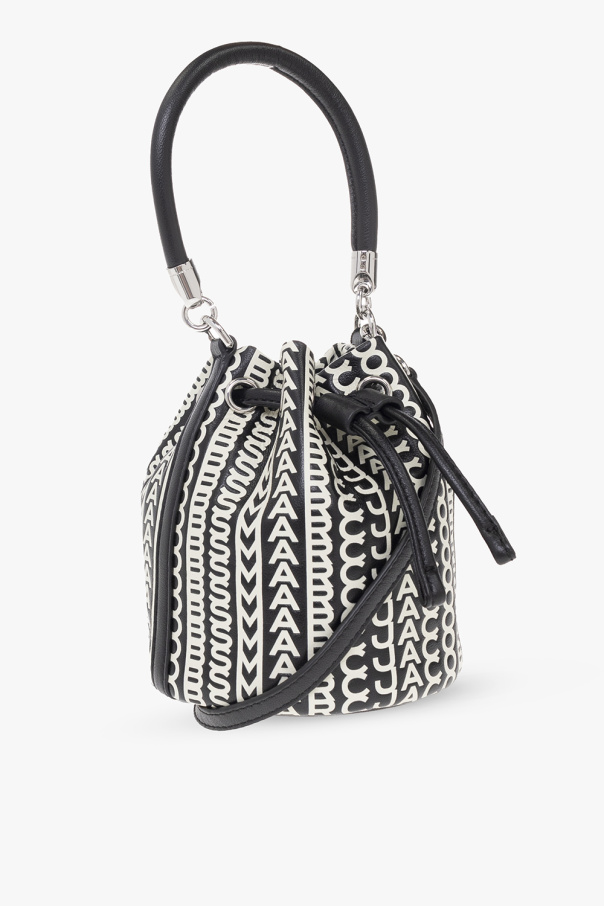 Black and white ‘The Bucket Micro’ shoulder bag from Marc Jacobs. Crafted from leather with an embossed logo pattern, this design cinches closed with drawcords and features a back patch, a half-round handle, a detachable and adjustable shoulder strap, silver-tone metal hardware and one internal compartment.