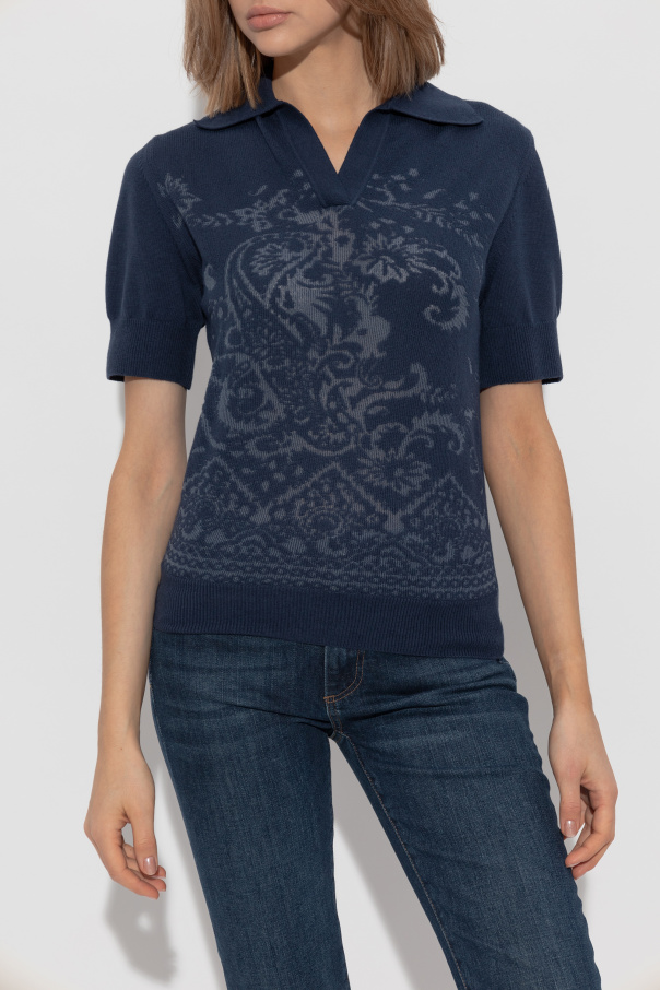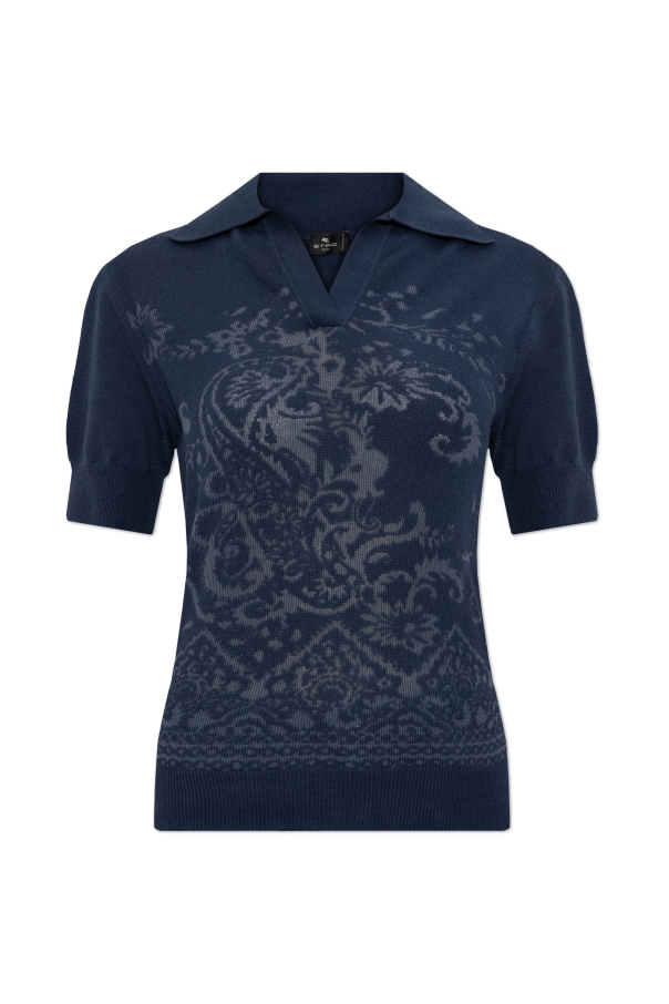 Introducing the Navy Polo with Decorative Pattern by the esteemed Italian fashion house, Etro. This exquisite piece embodies a harmonious blend of elegance and everyday sophistication. The dominant navy hue is adorned with subtle floral motifs, offering a touch of refinement to its classic design. Crafted from a luxurious blend of cotton, wool, polyamide, and elastane, this polo promises unparalleled comfort and a gentle fit. The classic cut, featuring short sleeves and a V-neck collar, exudes a contemporary yet timeless appeal, making it a versatile addition to any wardrobe. With its understated pattern, this polo is the epitome of style and versatility, seamlessly transitioning from casual to more formal ensembles. A testament to Etro\'s rich heritage, this piece is a nod to the brand\'s penchant for incorporating Asian-inspired designs into their collections. Why Choose This Product? Timeless navy color with elegant floral motifs. Crafted from a premium fabric blend for ultimate comfort. Versatile design suitable for various occasions. Reflects the iconic style of Italian fashion house Etro.