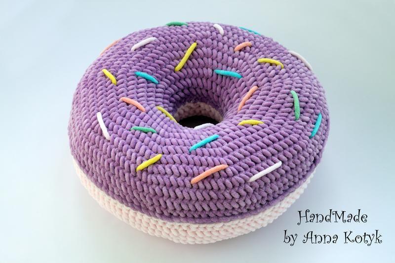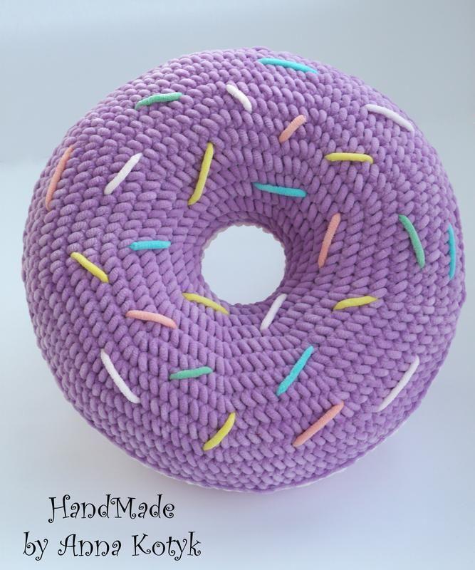 Подушка ручной работы донат. Выполнена из нежнейшей плюшевой пряжи двух цветов -лавандового и нежного пудрового. Диаметр 35 см. Эта вкусная красота прекрасно украсит детскую комнату, подушечка также может использоваться для игры и отдыха. Доступна для продажи! Возможно исполнение в любом количестве, цвете и размере.