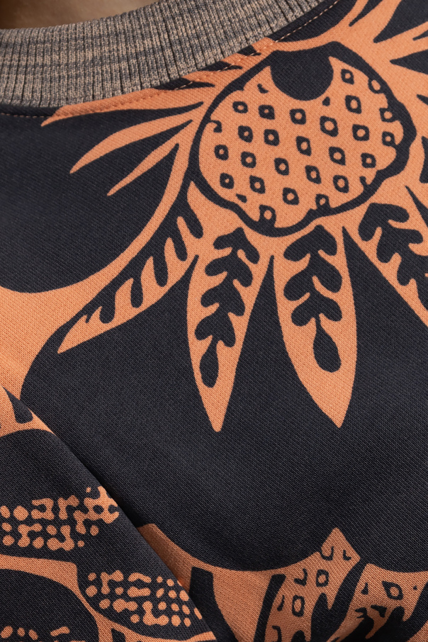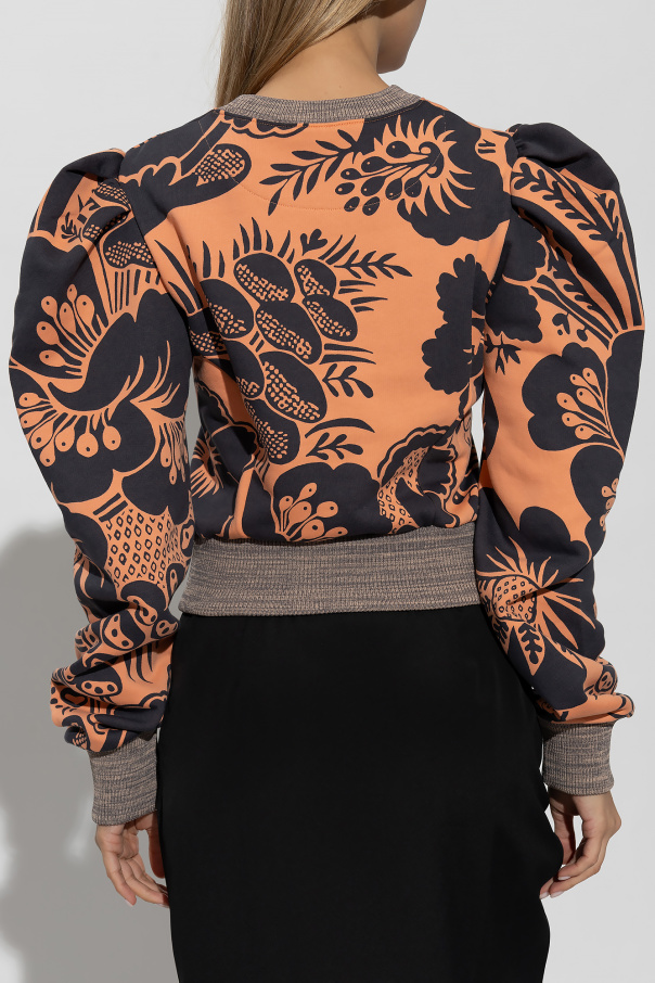 Navy blue and orange ‘Aramis’ crewneck sweatshirt from Vivienne Westwood. Made from organic cotton and embellished with a floral motif, this style features an embroidered colourful logo on the front, puff long sleeves and ribbed trims on the collar, bottom hem and cuffs.
