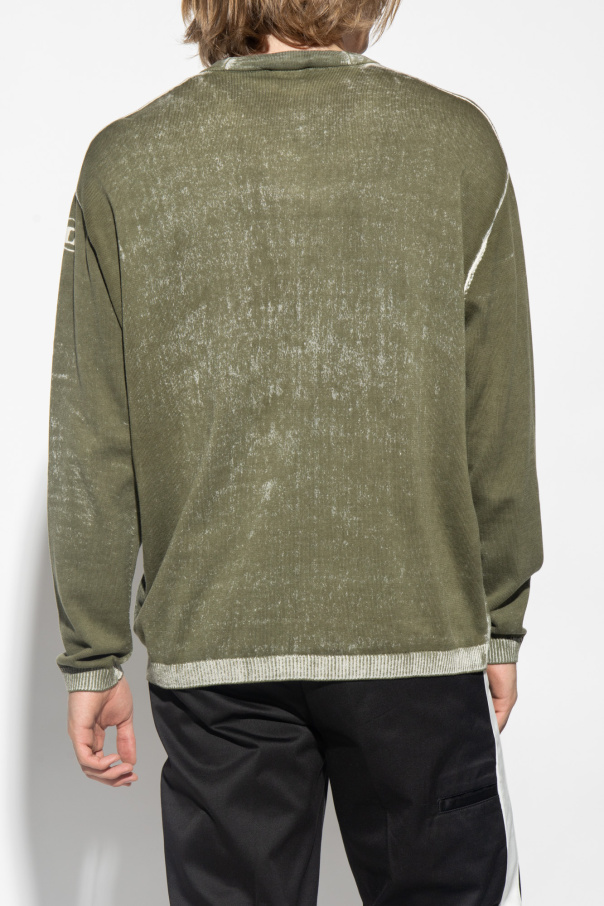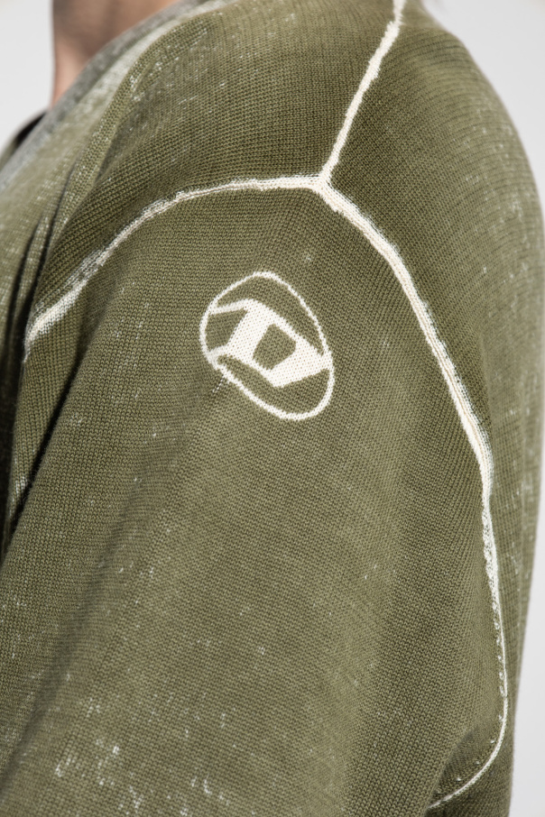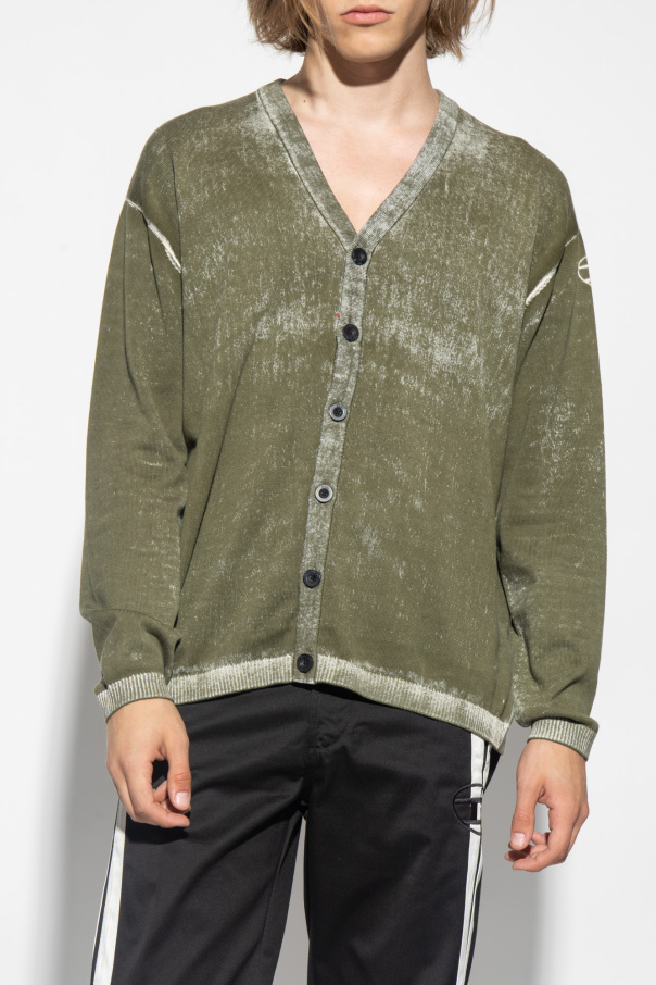 Green and grey ‘K-LARENCE-CARDIGAN-B’ cardigan from Diesel. Made of cotton, this design features button fastenings, paint splatter effect and ribbed trims at the hem and cuffs.
