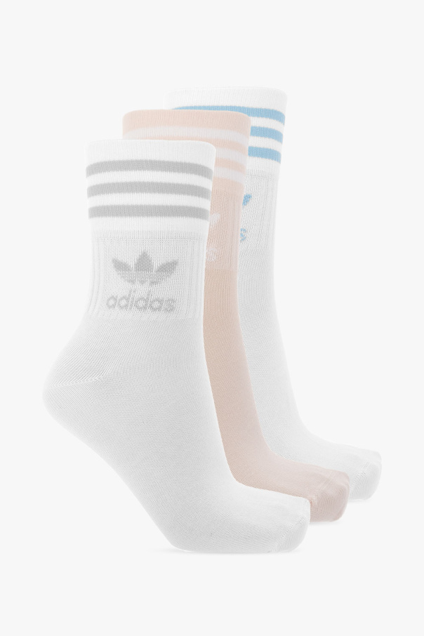 White (2 pairs) and light pink (1 pair) socks three-pack from ADIDAS Originals. Crafted from a blend of cotton and recycled materials, each pair features an embroidered logo and signature three stripes in grey, blue and white.