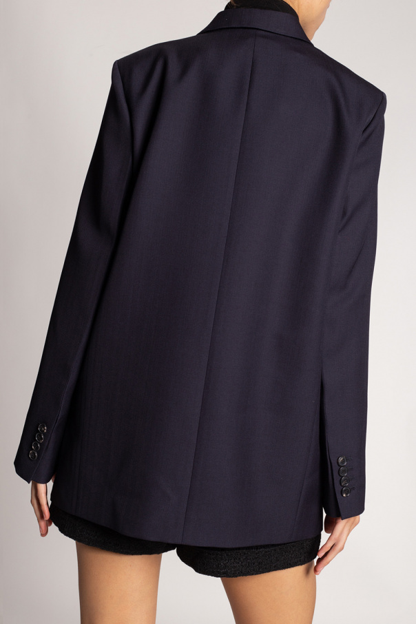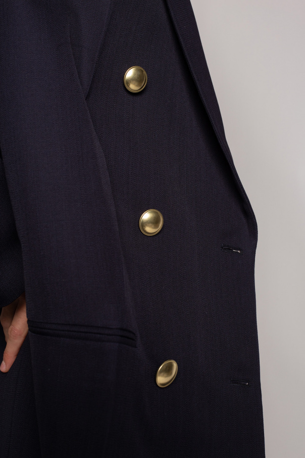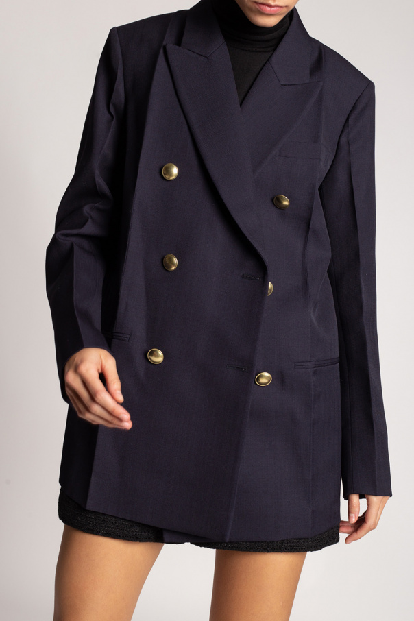 Navy double-breasted blazer from Victoria Beckham. Crafted from wool, this garment features peak lapels, three slip pockets and long sleeves with button cuffs.