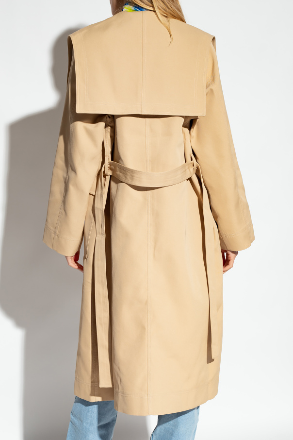 Beige coat from Ganni. Fastened with buttons, this long sleeve design features a wide collar with a logo embroidery and two flap pockets on the front.