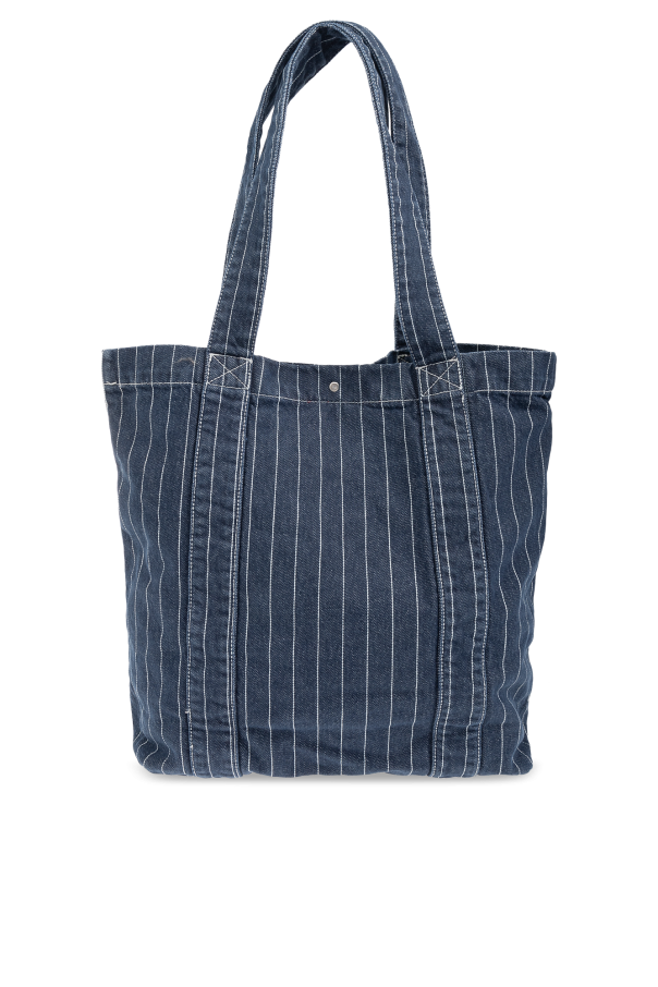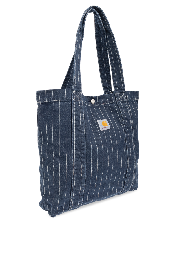 Navy denim shopper bag from Carhartt Wip. Made of cotton, this design features buttons, a logo patch, stripe pattern, two half-round handles and silver-tone metal hardware.