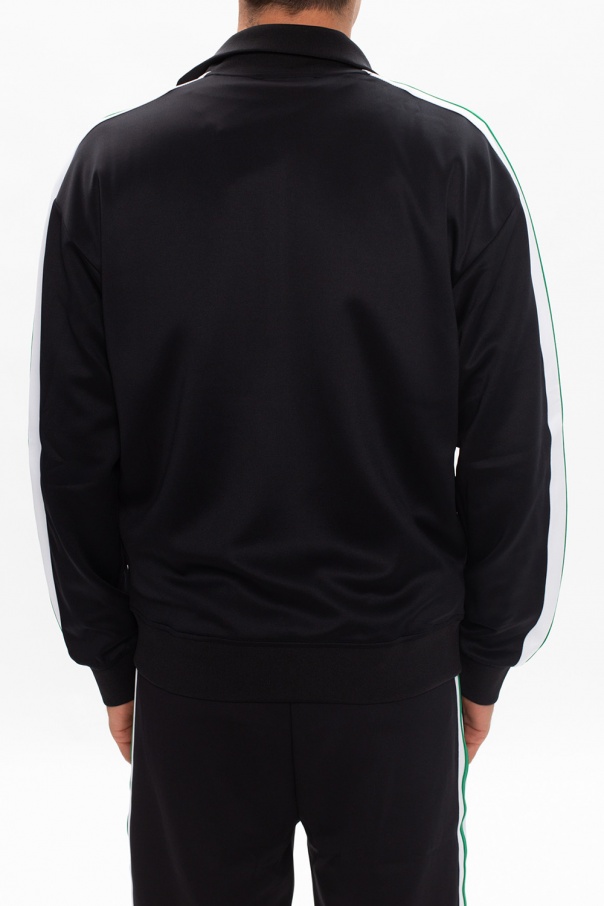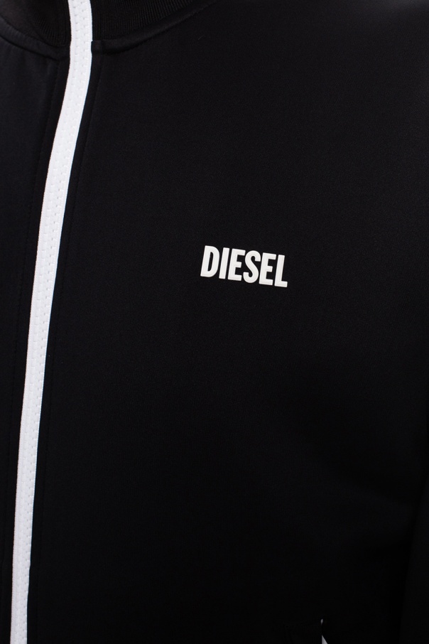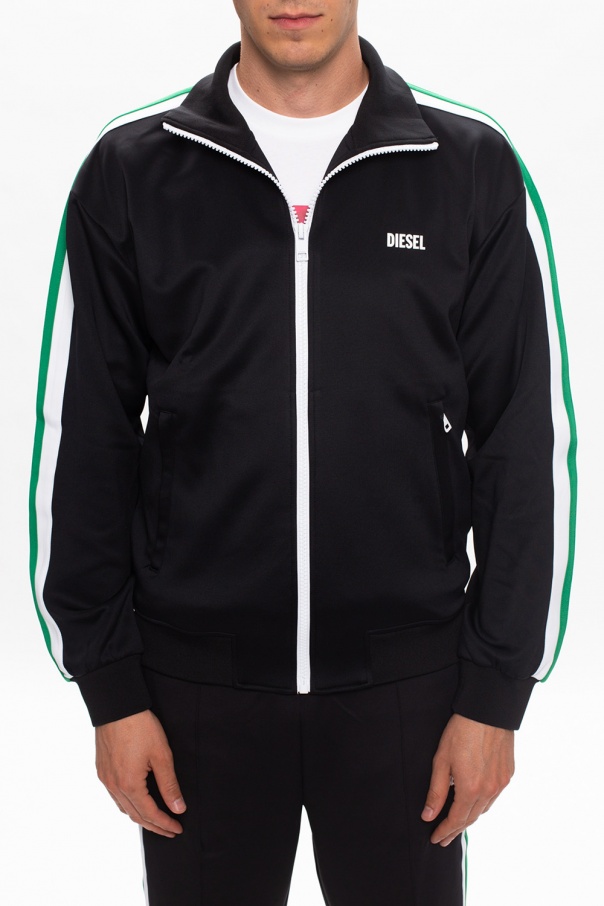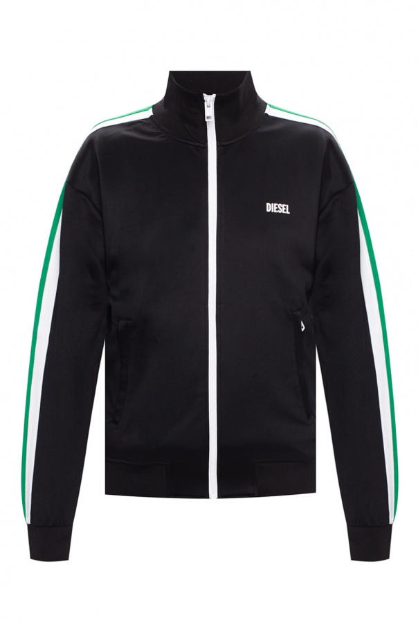 Black sweatshirt from Diesel. Fastened with a zip, this item is characterised by a band collar, white logo detail, two zip pockets on the front, white and green stripes at the sleeves and ribbed cuffs.