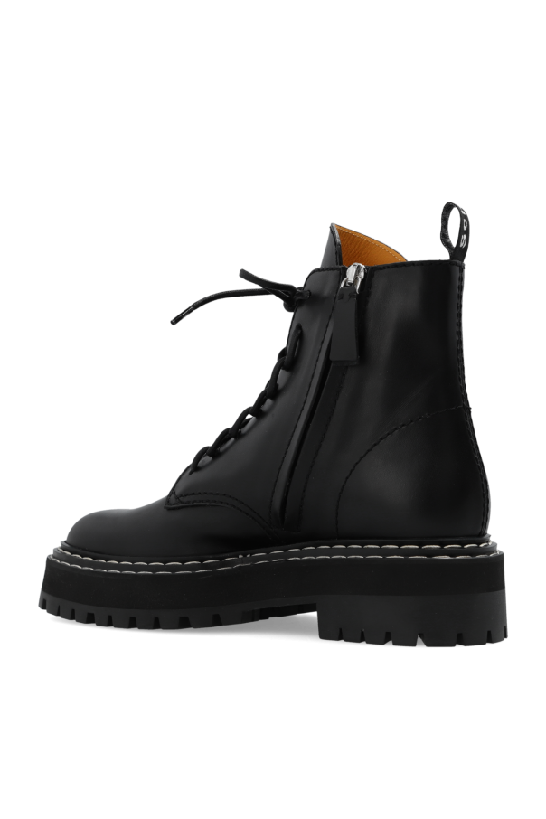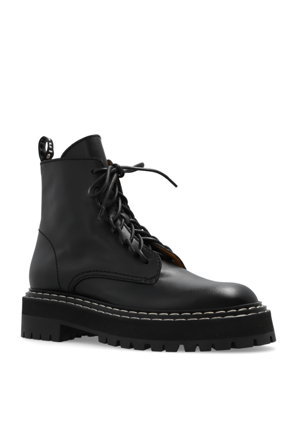Black combat boots from Proenza Schouler. Made of leather, this pair features a side zip, decorative lacing, branded pull strap at the back, white stitches and black rubber sole.