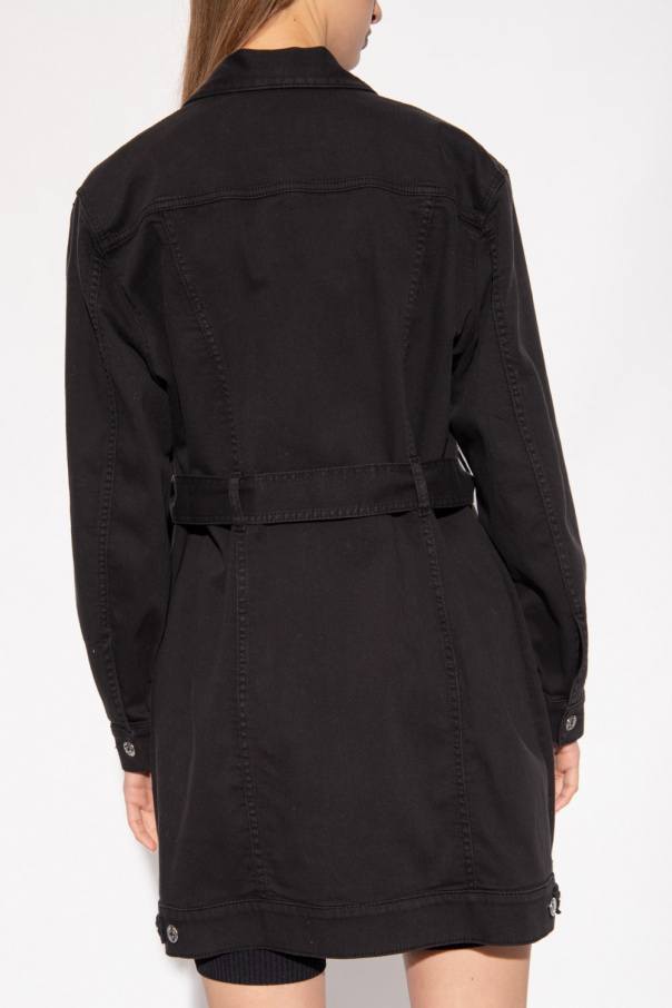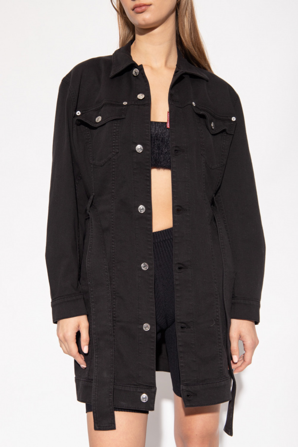 Black denim jacket from Dsquared2. Fitted at the waist, this style features a long silhouette with button fastenings, an attached waist-cinching belt, a red logo patch on the front, two flapped pockets, two welt pockets and long sleeves with button cuffs.