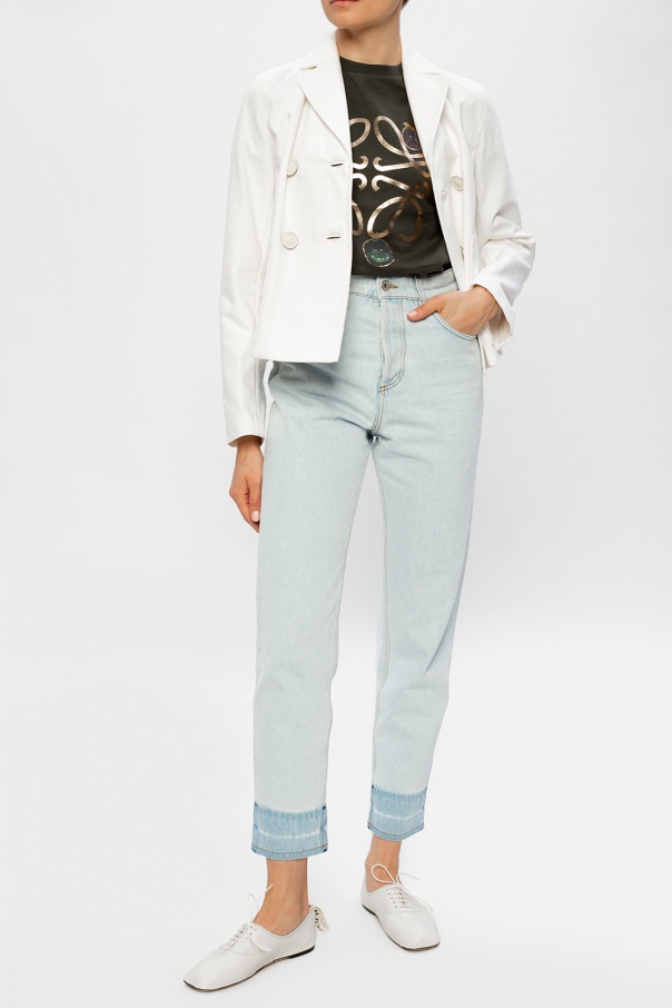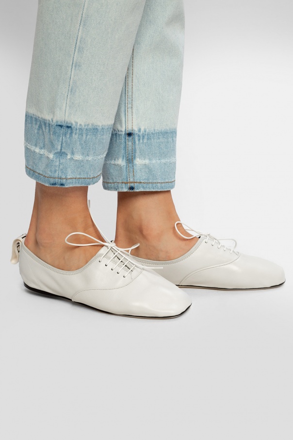 White derby shoes from Loewe. Embellished with an embossed logo, this lace-up design was made of calf leather and features lace-up fastening, square toe and black and beige leather sole.