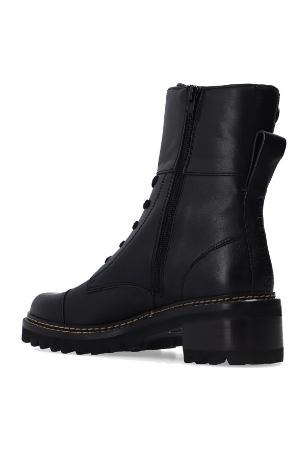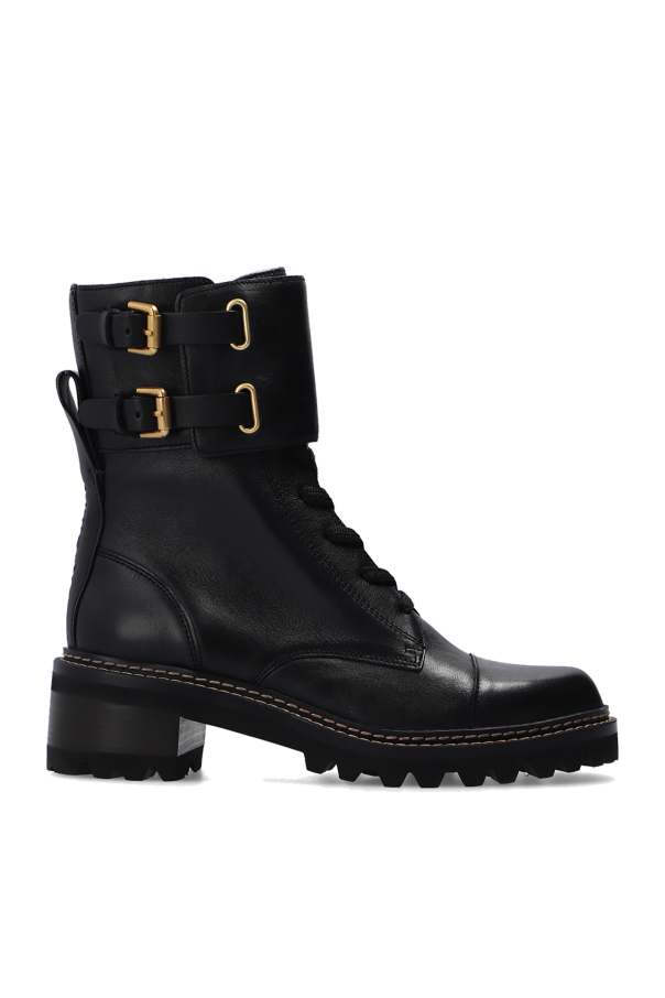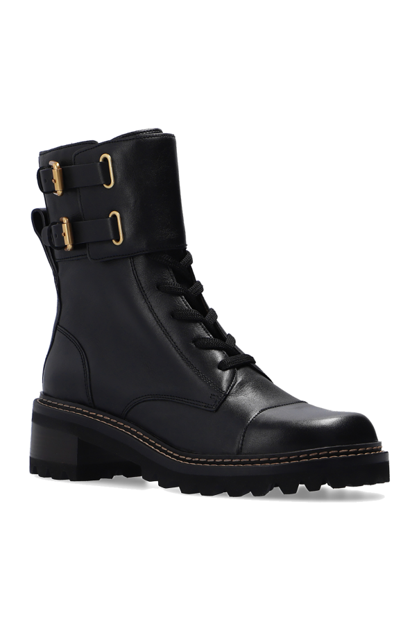 Black ‘Mallory’ heeled ankle boots from See By Chloé. Crafted from leather, this lace-up pair features buckle straps one the sides, a logo embossed at the back and a black rubber sole.