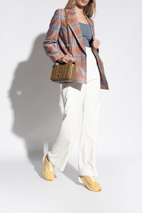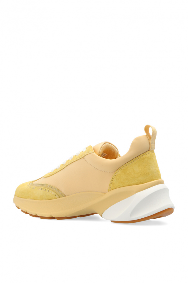 Dark yellow ‘Good Luck’ sneakers from Tory Burch. Crafted from fabric and trimmed with suede overlays, this lace-up model features a branded patch and a white, beige and dark yellow rubber sole.