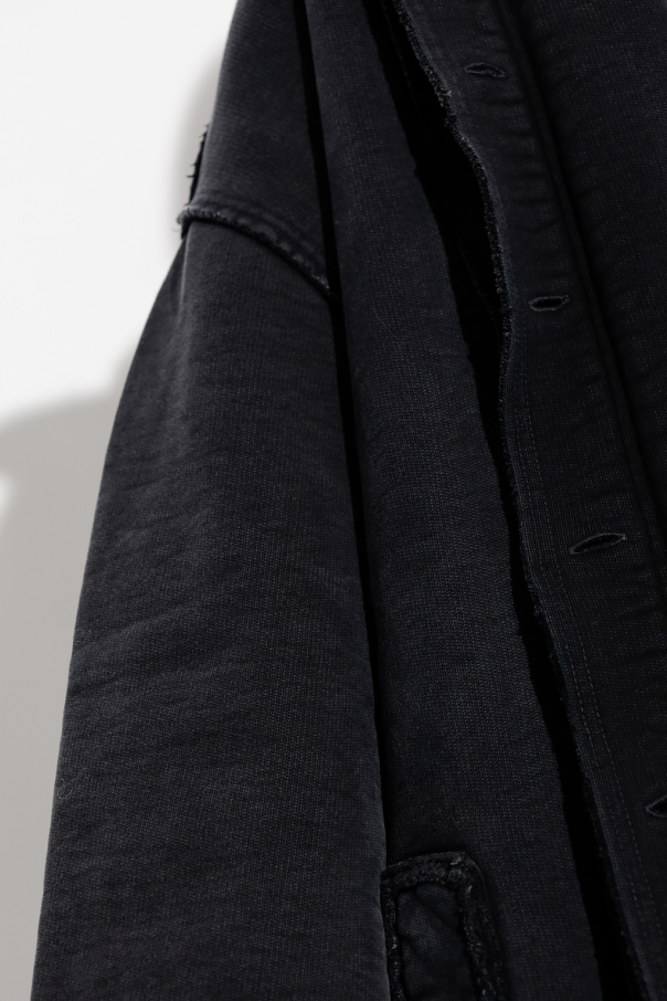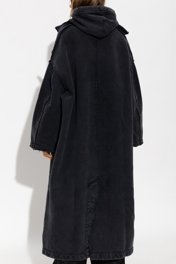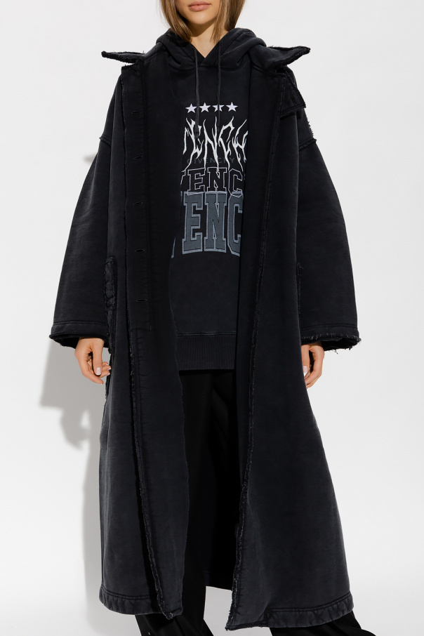 Dark grey oversize long coat from Givenchy. Fastened with buttons with a concealed placket, this design has a stand collar with buttons, two slip pockets, long sleeves, vents at the hem, raw cut edges and vintage effect.