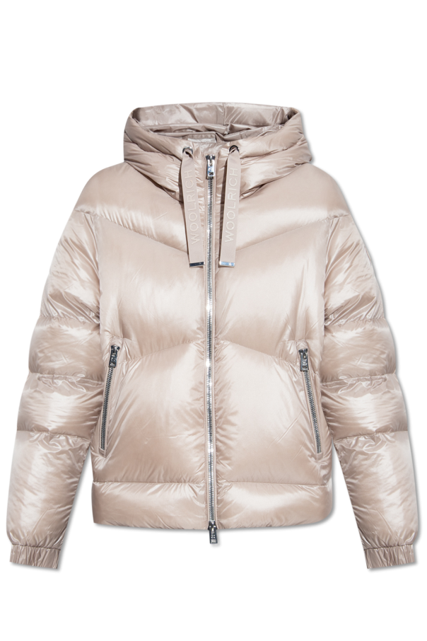 Greyish beige ‘Aliquippa’ down jacket from Woolrich. Made of glossy fabric, this design features a two-way zip, logo appliqué on the side, drawstring hood and hem, two zipped pockets and long sleeves with elasticated cuffs.
