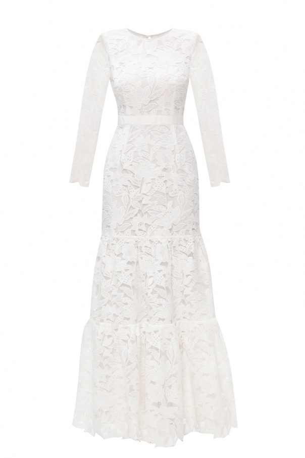 White maxi dress from Self-Portrait. Rendered in premium lace, this design is complete with zip and hook & eye closures, round neck with button closing and long sleeves with a buttoned split.