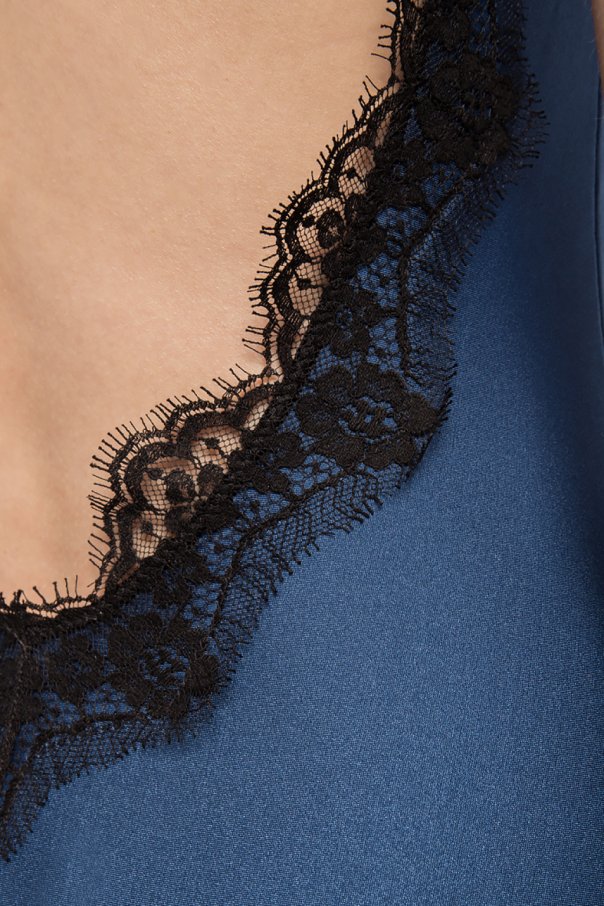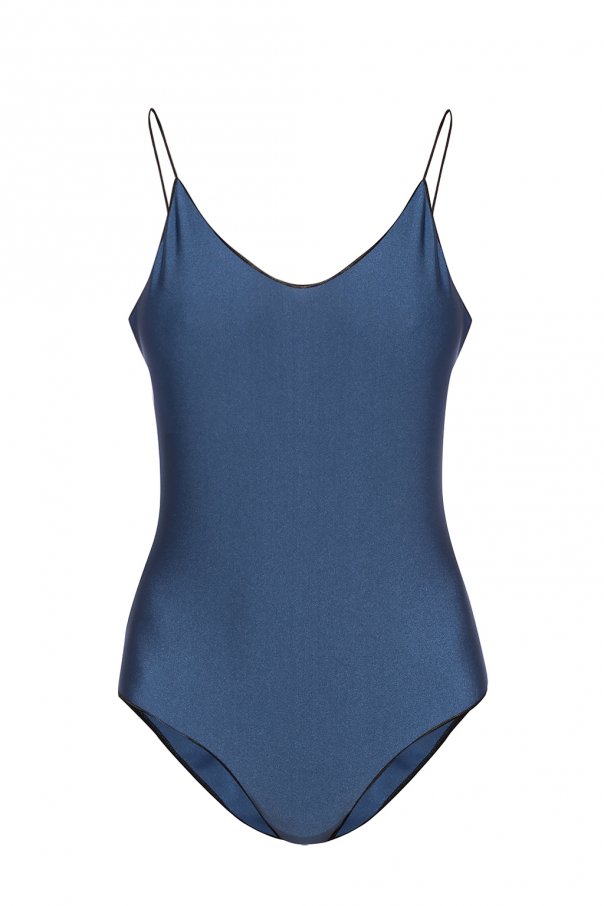 Blue one-piece swimsuit from Oseree. Finished with black lace. Cut-out detail at the back.