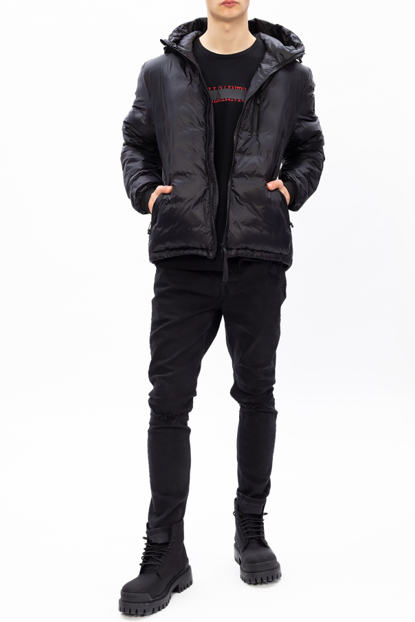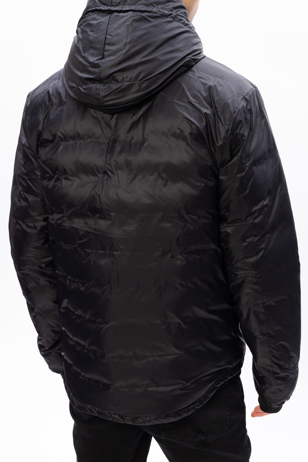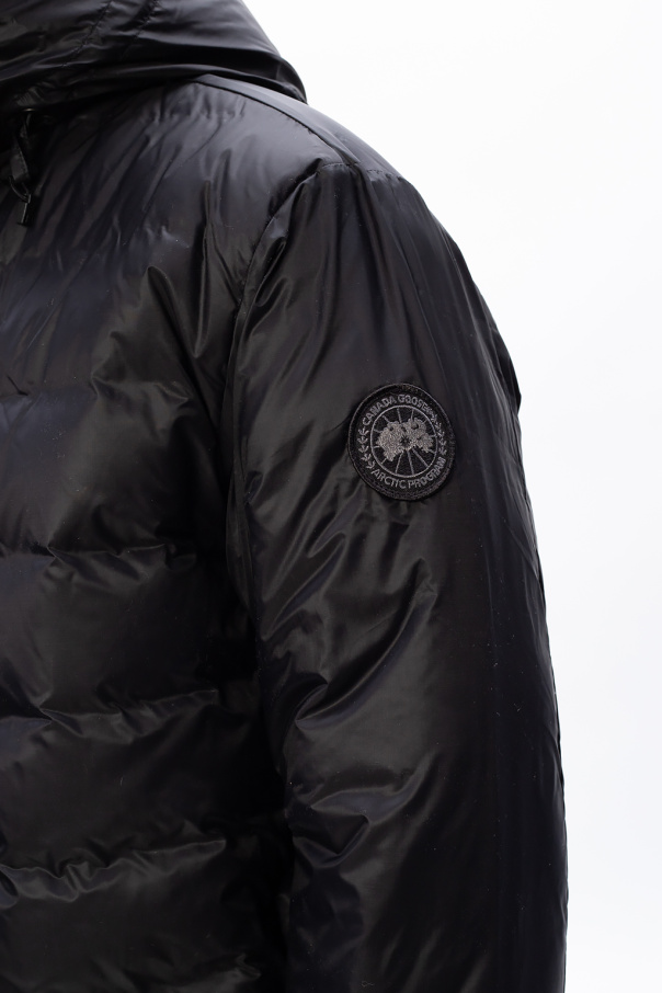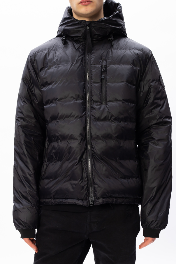 Black ‘Lodge Hoody’ down jacket from Canada Goose. Fastened with a two-way zip, this garment features a drawstring hood, logo patch and three front zip pockets.