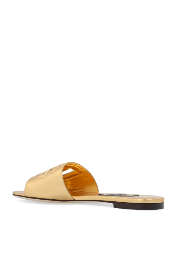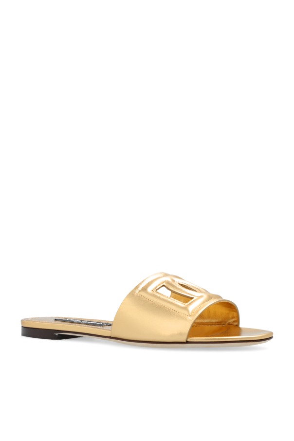Gold-tone slides from Dolce & Gabbana. Made of leather with a round toe, this model sits on a cream leather sole and features a cutout, tactile logo on the front.
