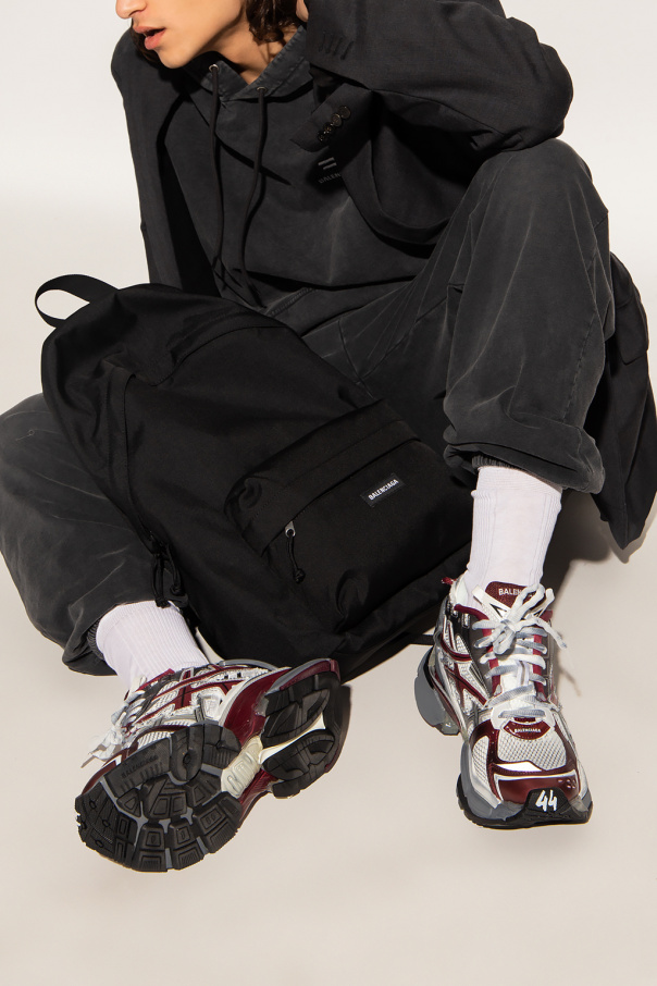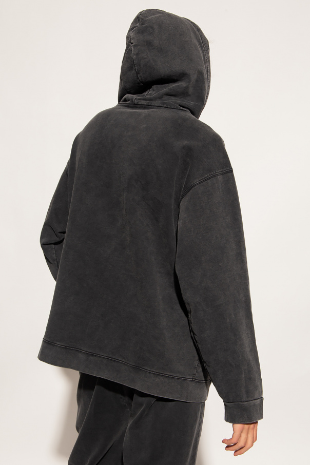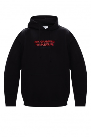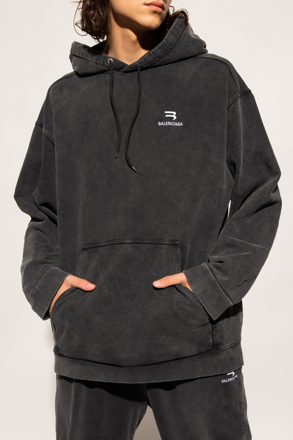 Black and grey sweatshirt with a drawcord-adjustable hood from Balenciaga. Crafted from cotton, this hoodie features a kangaroo pocket and an embroidered white logo on the front and elasticized trims on the bottom hem and cuffs.