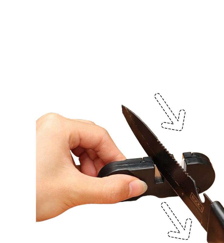 - Эта компактная точилка оснащена двумя гнездами для заточки и алмазным стержнем, что делает ее универсальным инструментом для обслуживания лезвия в любых условиях.
