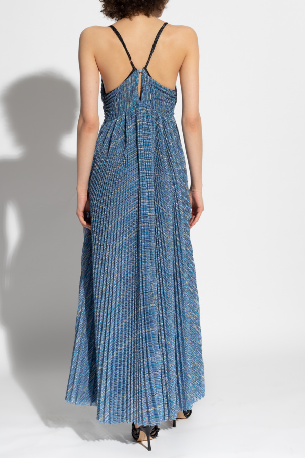 Blue pleated dress from Forte Forte. Made of fabric inlaid with multicolored threads, this flared, loose-fitting design features buttons at the back, empire waist, adjustable shoulder straps and flared skirt.