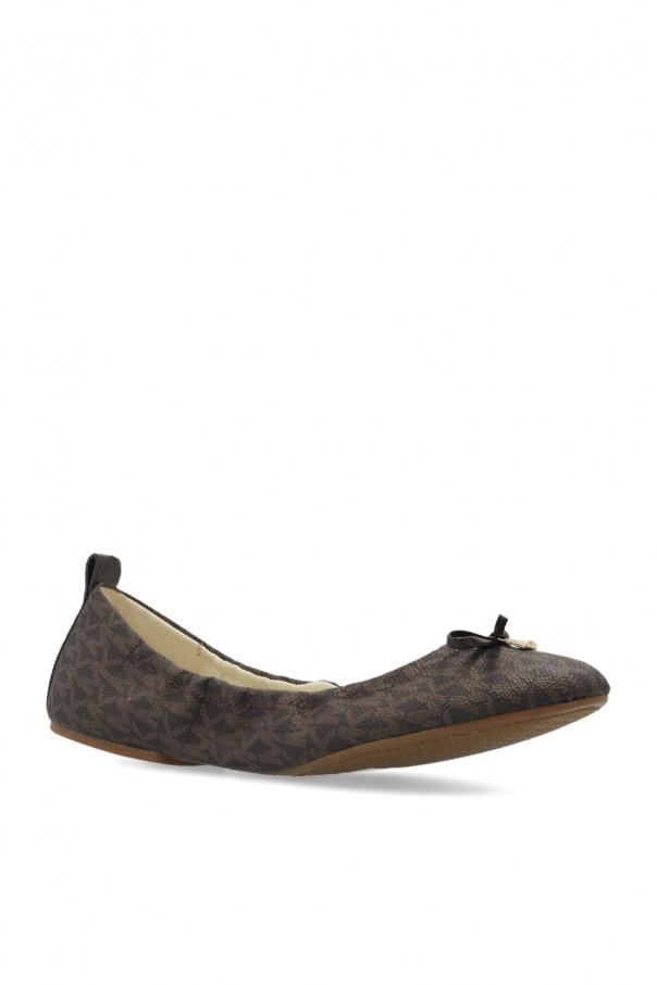Brown ‘Juliette’ ballet flats from Michael Michael Kors. Embellished with a monogram pattern, this model features a distinctive bow on the front, a branded padlock application and a brown rubber sole.