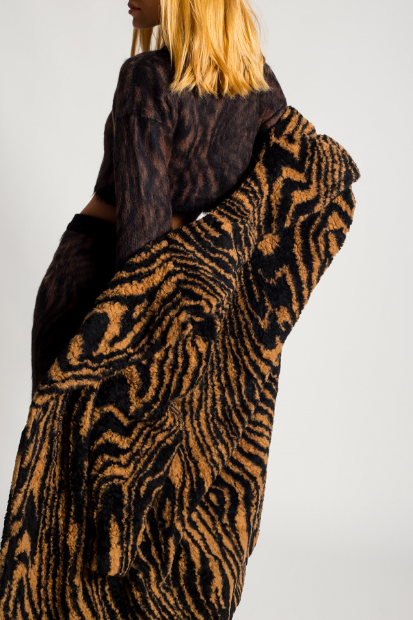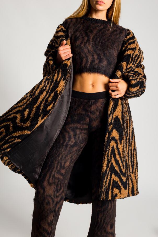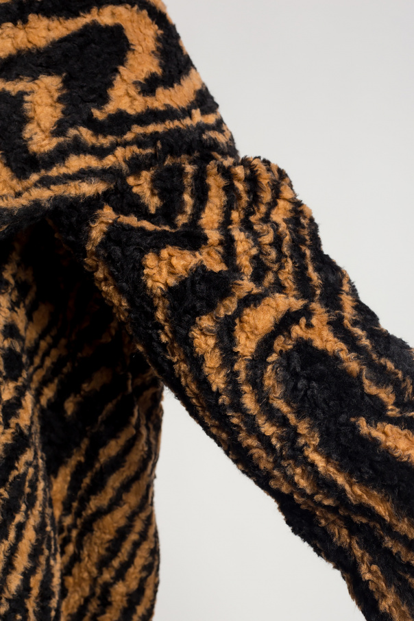 Brown and black coat from Opening Ceremony. Made of faux fur, this design features snap fastenings, notch lapels, a pattern and two front pockets.
