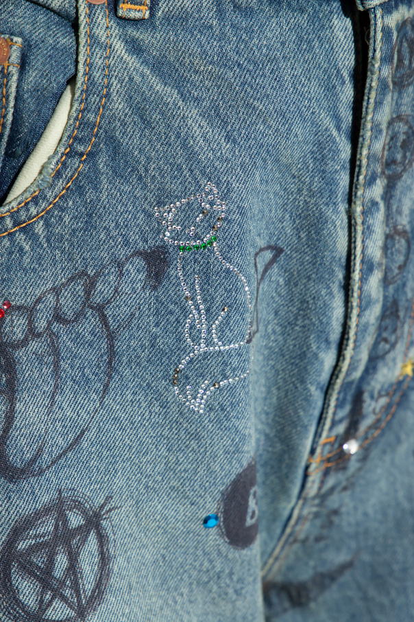 Blue jeans from Balenciaga. Crafted from cotton, this pair falls with wide legs and features a zip fly with a button, classic five pockets, distressed detailing, glossy inserts and ballpoint pen marks.