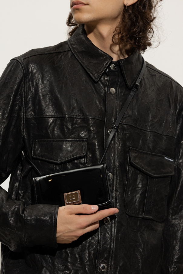 Black shoulder bag from Acne Studios. Crafted from glossy faux-leather, this design secures with a snap and features a frontal patch with a brown metal Face logo plaque, a detachable and adjustable shoulder strap, silver-tone metal hardware and a divided interior with a zipped compartment and one card slot.