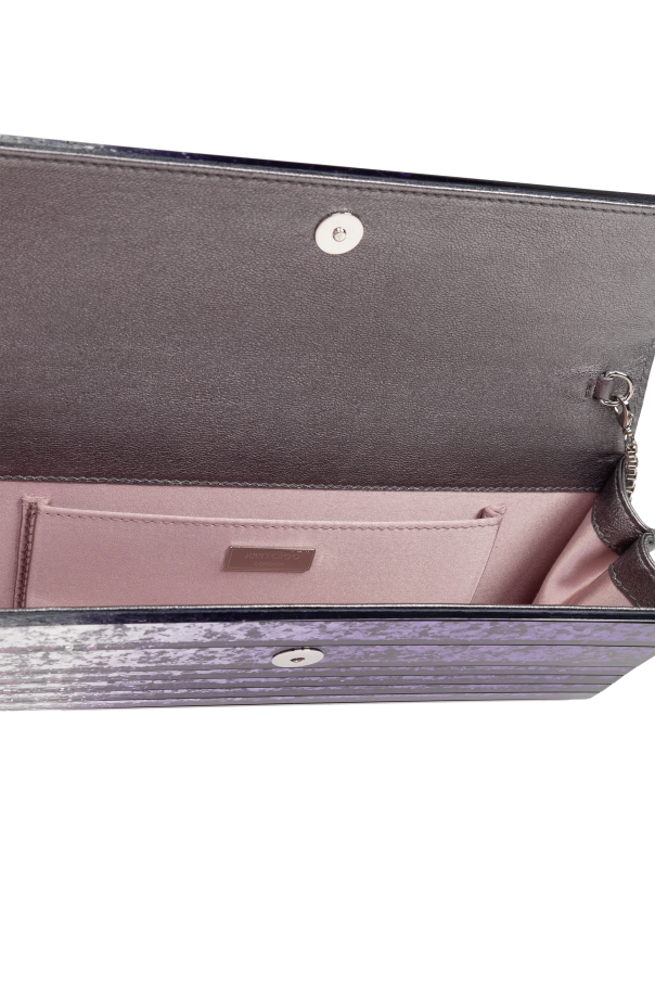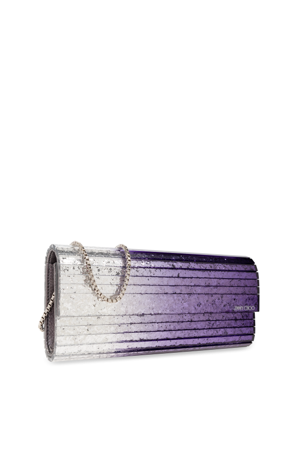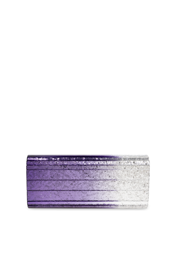 Introducing the \'Sweetie\' Clutch by Jimmy Choo, a masterpiece of accessory design that redefines elegance. Fashioned from a blend of exquisite materials, including acrylic and leather, this clutch boasts a shimmering, textured surface that captures and reflects light, thanks to its finely crafted, sequin-like appearance. The dominant hue, a sophisticated gradient of purple, transitions gracefully from a deeper shade at the base to a lighter tone at the top, enhancing its allure. The \'Sweetie\' is distinguished by horizontal stripes of glittering elements that emulate layers or tassels, adding depth and movement to its sleek, rectangular silhouette. A detachable metal chain offers versatility, allowing it to be worn as a shoulder bag for hands-free convenience. The interior reveals a lighter-colored lining of smooth texture, equipped with a compartment and a slip pocket, secured by a magnetic snap closure, ensuring your essentials are safely stowed yet easily accessible. With dimensions that make it a perfect companion for evening events, this clutch comfortably fits in hand, its size assessed by being effortlessly held. The \'Sweetie\' Clutch is not merely an accessory; it is a statement piece that encapsulates the essence of luxury and sophistication inherent to the Jimmy Choo brand. Why Invest in the \'Sweetie\' Clutch? Exquisite blend of acrylic and leather, offering durability and elegance. Unique gradient purple hue, enriched with sparkling details for a lavish appearance. Versatile wearability with a detachable metal chain, easily transitioning from clutch to shoulder bag. Practical interior features, including a compartment and slip pocket, secured by a magnetic snap. Iconic design by world-renowned designer Jimmy Choo, making it a covetable piece for any collection.