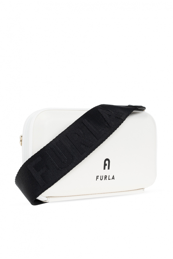 White ‘Iris’ shoulder bag from Furla. Crafted from leather, this model features a zip fastening, white logo print, detachable and adjustable fabric strap with a logo, gold-tone metal hardware and one internal compartment with two card slots.