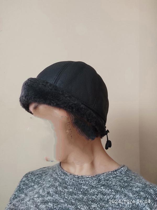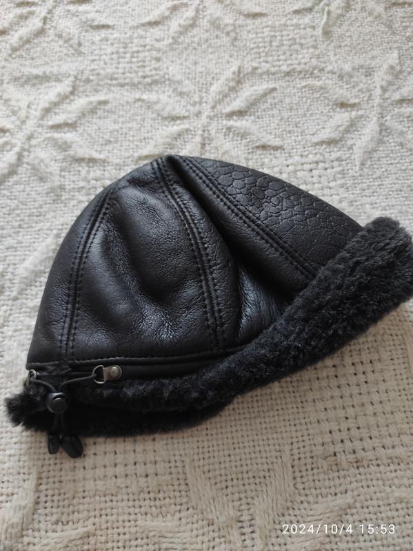 Зимняя женская шапка из кожи на цегейке.Астметричного фасона, сбоку украшена цветком, сзади регулируется ширина.Очень необычный и теплый.Стан идеален. На окружность головы 55-56 см.