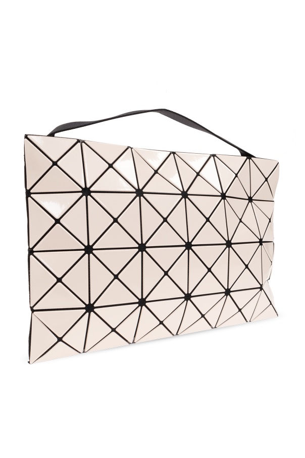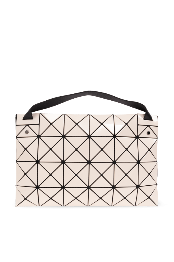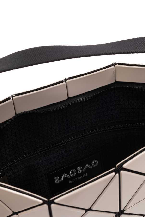 Cream and black shoulder bag from Bao Bao Issey Miyake. This item fastens via a zip and showcases an embossed logo and geometrical pattern. It is complete with a long, adjustable shoulder strap and one internal compartment with a zip pocket.
