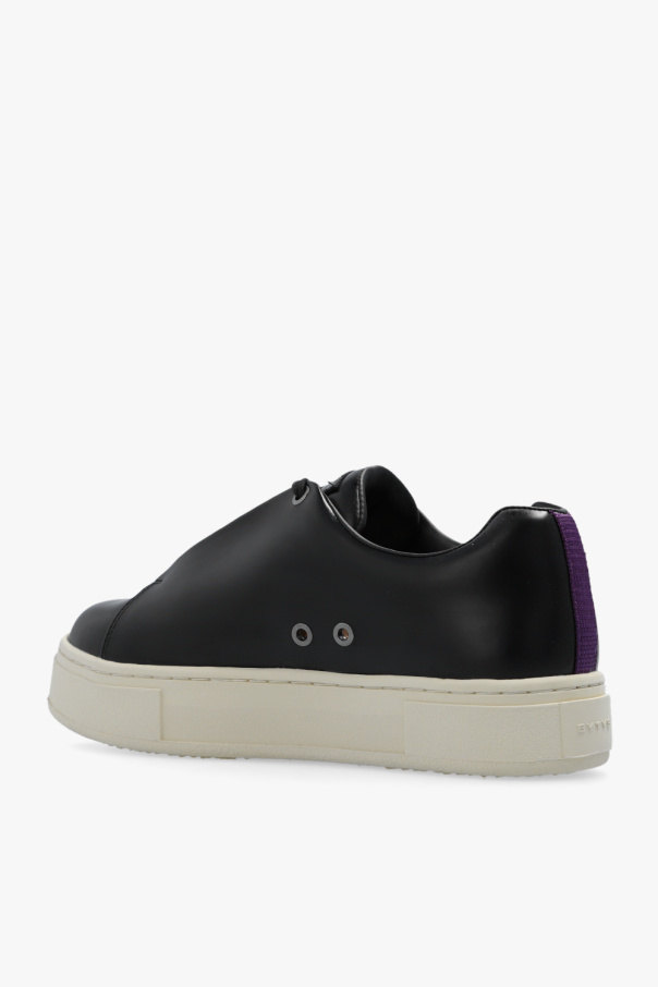 Black ‘Doja’ sneakers from Eytys. Crafted in glossy leather, this lace-up model sits on a cream rubber sole and features a purple logo patch for brand recognition.