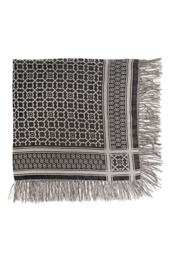 Grey scarf from Salvatore Ferragamo. Crafted from a cotton and cashmere blend, this design is enriched by a pattern and fringe edges.