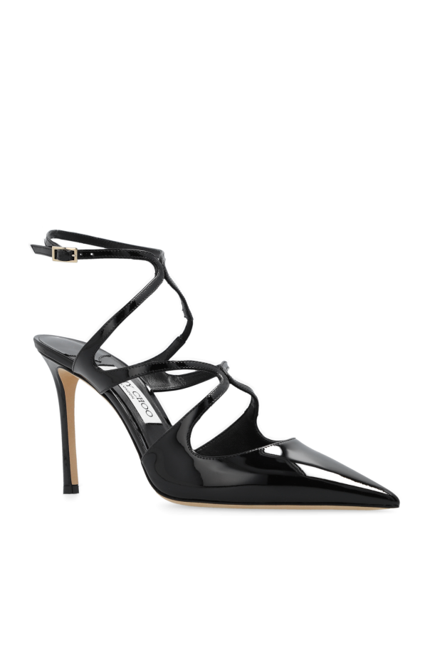 Black ‘Azia’ pumps from Jimmy Choo. Made of glossy leather with a pointed toe silhouette, this model sits on a beige leather sole and features an adjustable ankle strap with a buckle and decorative cutout detailing on the front.