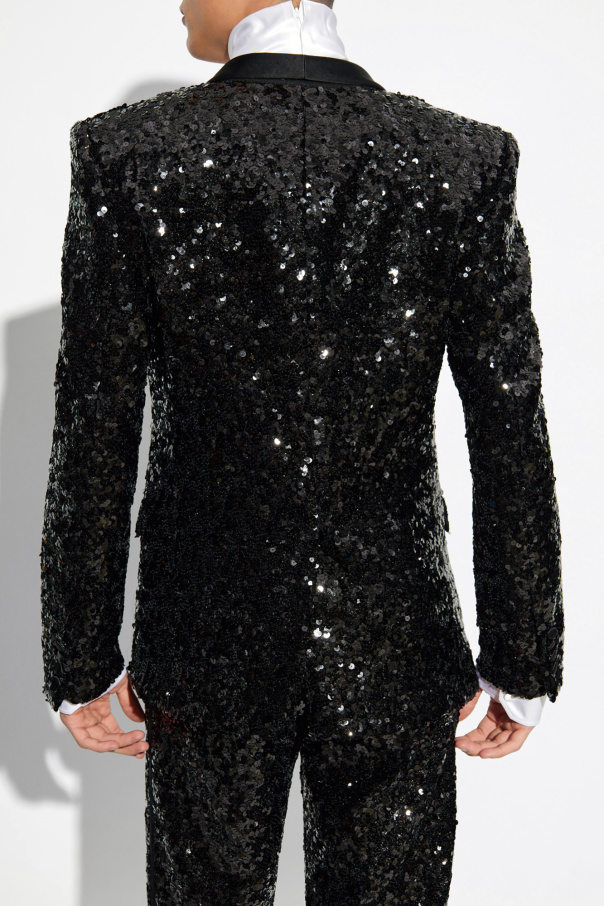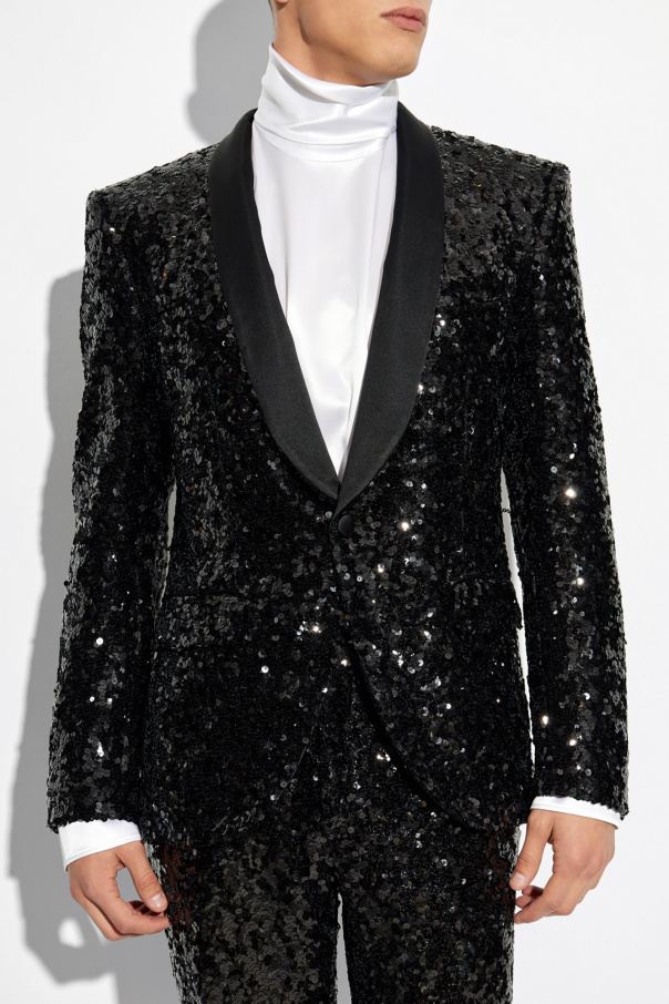 Introducing the Sequin Blazer from the prestigious Dolce & Gabbana collection, an epitome of refined elegance and timeless style. This exquisite black blazer, adorned with shimmering sequins, exudes a luxurious allure perfect for the most distinguished occasions. Meticulously crafted with a classic, sophisticated cut, this blazer features pronounced shoulders and a sleek fit that accentuates the silhouette. The entire surface is embellished with luminous black sequins, creating a captivating, opulent appearance. The blazer boasts smooth satin lapels, providing a striking contrast to the glittering sequins, and features nearly invisible buttons to maintain a seamless look. Standard-length sleeves with finely finished cuffs allow for the elegant display of shirt cuffs beneath. Complete with a smooth black lining and a perfectly tailored fit, this blazer\'s uniform sequin pattern highlights its lavish nature. The inclusion of three discreet pockets enhances its practical elegance. Why Buy This Product? Elegant Design: Classic cut with a modern twist, featuring pronounced shoulders and a sleek fit. Luxurious Materials: Made from a blend of Nylon, Silk, Elastane, and Polyester for a sumptuous feel and appearance. Exquisite Details: Shimmering black sequins, satin lapels, and nearly invisible buttons. Iconic Brand: Designed by the world-renowned Dolce & Gabbana. Practical Elegance: Includes three discreet pockets for added functionality.