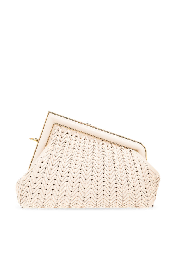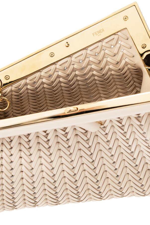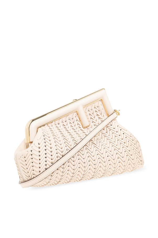 Cream ‘Fendi First Small’ shoulder bag from Fendi. Made of braided leather, this design secures with a decorative ‘F’ snap and features a detachable and adjustable shoulder strap, gold-tone metal hardware and one internal compartment.