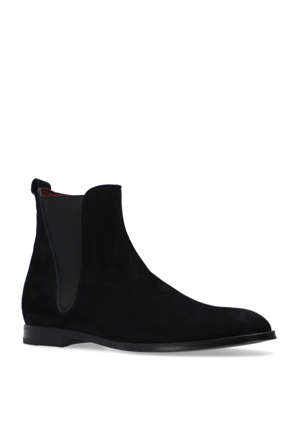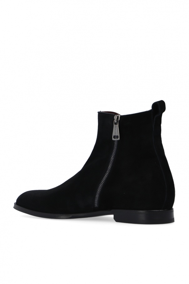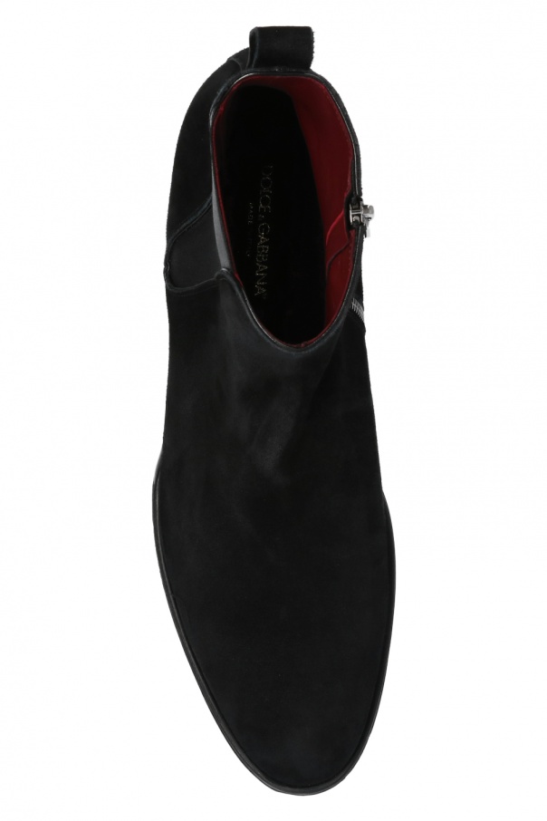 Black ankle boots from Dolce & Gabbana. Crafted from suede, this design features a side zip, grosgrain pull tab at the back and a leather sole in maroon and black.