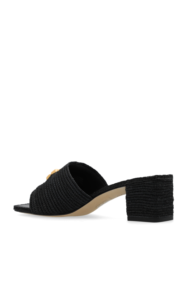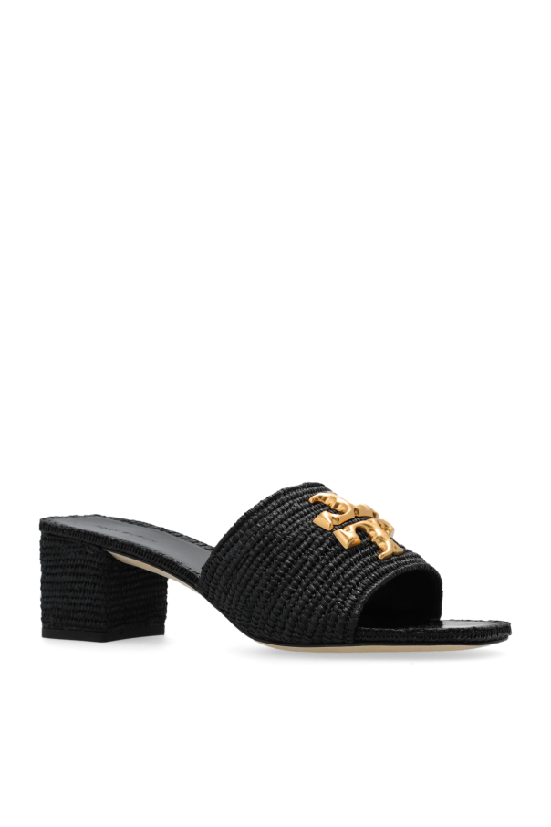 Black ‘Eleanor’ mules from Tory Burch. Crafted in woven raffia and trimmed with leather, this model sits on a beige leather sole and features gold-tone logo hardware.