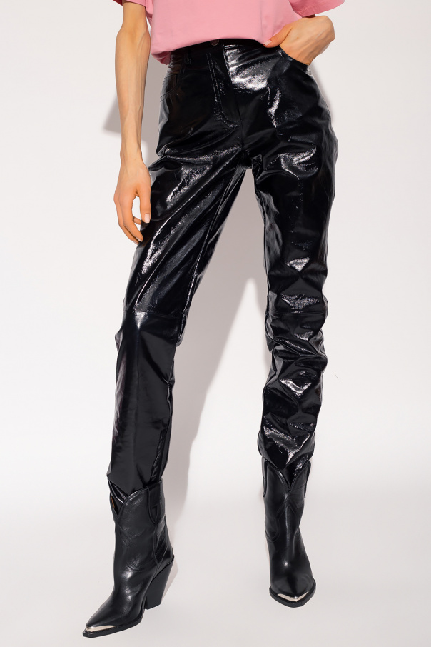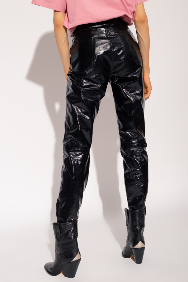 Black trousers from Etro. Crafted from patent lamb leather, this pair falls down with tapered legs and is complete with three front pockets and two back pockets with an ‘Etro Cube’ logo print.