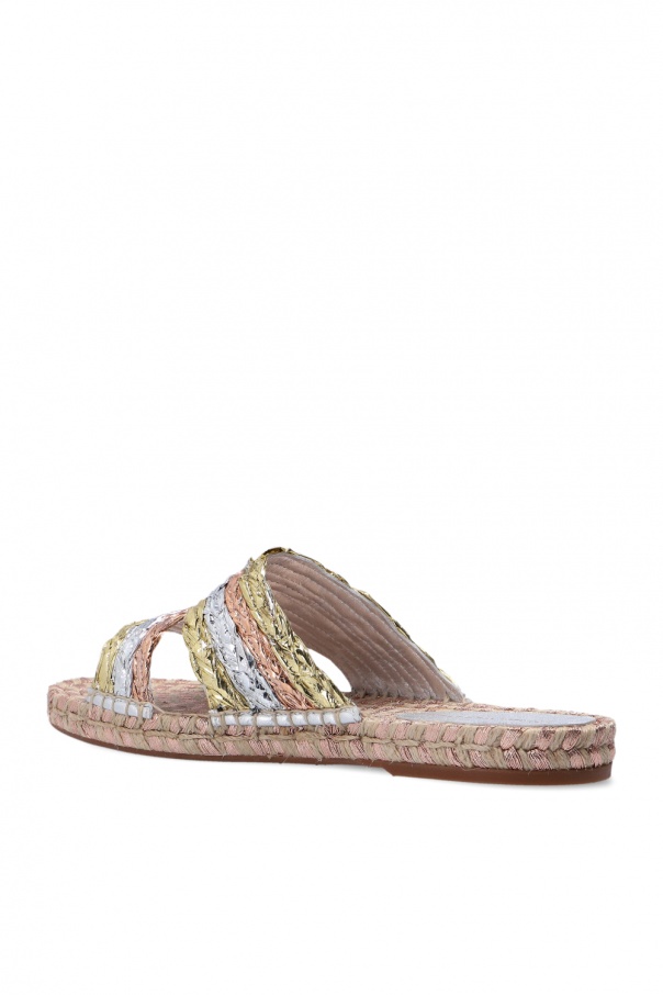 Gold-tone, silver-tone and rose gold-tone ‘Ines’ slides from Sophia Webster. Resting on a beige rubber sole, this design is inlaid with a lurex thread.