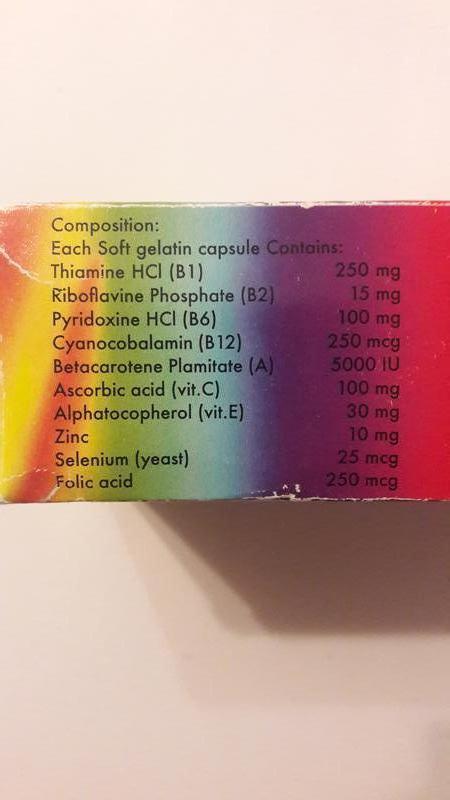 Склад: Кожна м'яка желатинова капсула містить: тіамін HCl (B1) 250 мг + рибофлавін фосфат (B2) 15 мг + піридоксин HCl (B6) 100 мг + ціанокобаламін (B12) 250 мкг + бетакортин пальмітат віт C) 100 мг + альфа-токоферол (віт. E) 30 мг + цинк 10 мг + селен (дріжджі) 25 мкг + фолієва кислота 250 мкг.