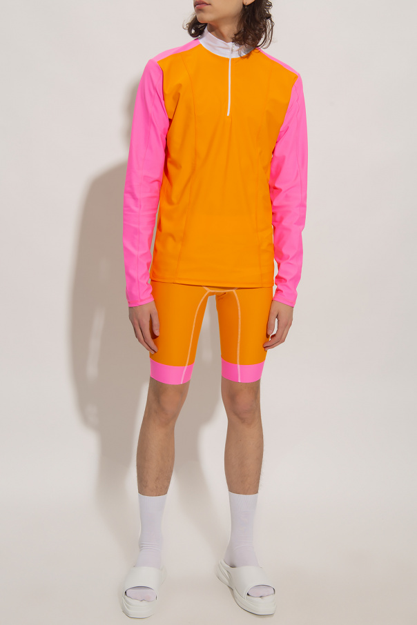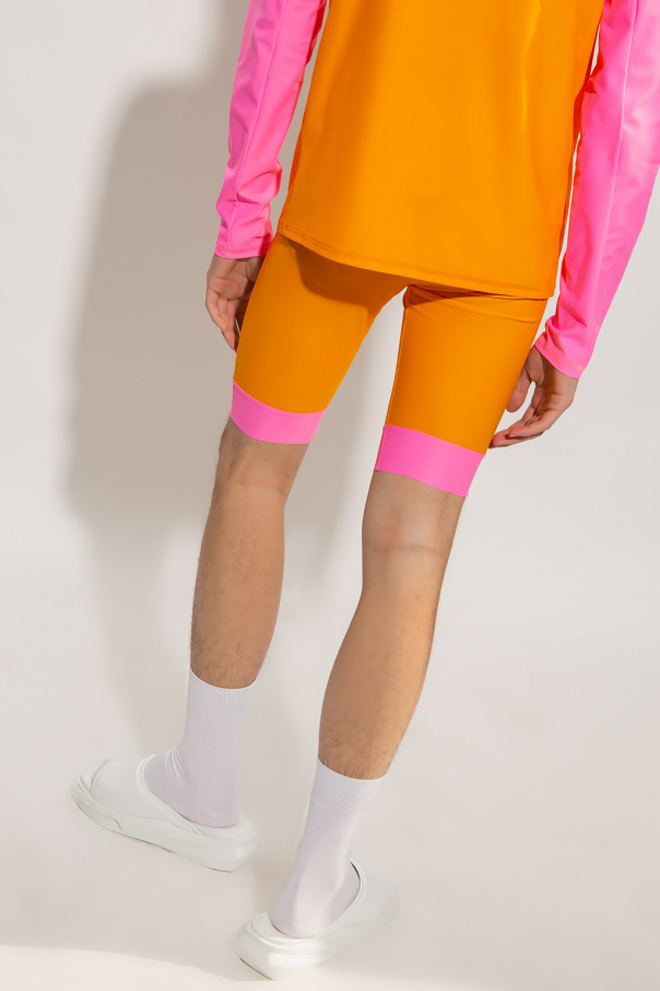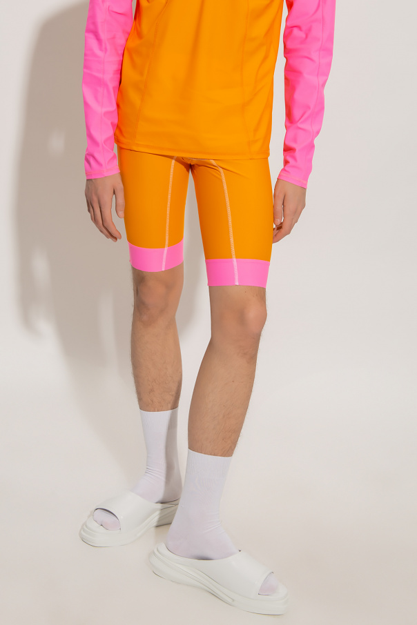 Orange and pink training leggings from Jacquemus. Cut with a cropped fit, they feature an elasticated waistband, decorative stitching details and frayed hems.