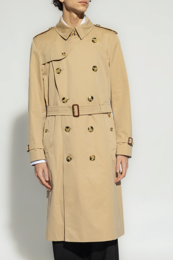 Beige ‘Kensington Long’ double-breasted trench coat from Burberry. Crafted in shower-resistant cotton gabardine, this midi design features buttons, a collar with hook fastening, epaulettes, storm flap, two buttoned flap pockets, pleat at the back and long sleeves with adjustable tabs at the cuffs. The multicolored lining is decorated with the brand’s signature check pattern.